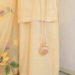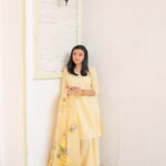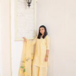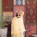 Yellow dress it’s a complete three piece stitch outfit with the short shirt and wide leg pantspants. Then Shisha embroidery on shirt and hand painted organza dupatta